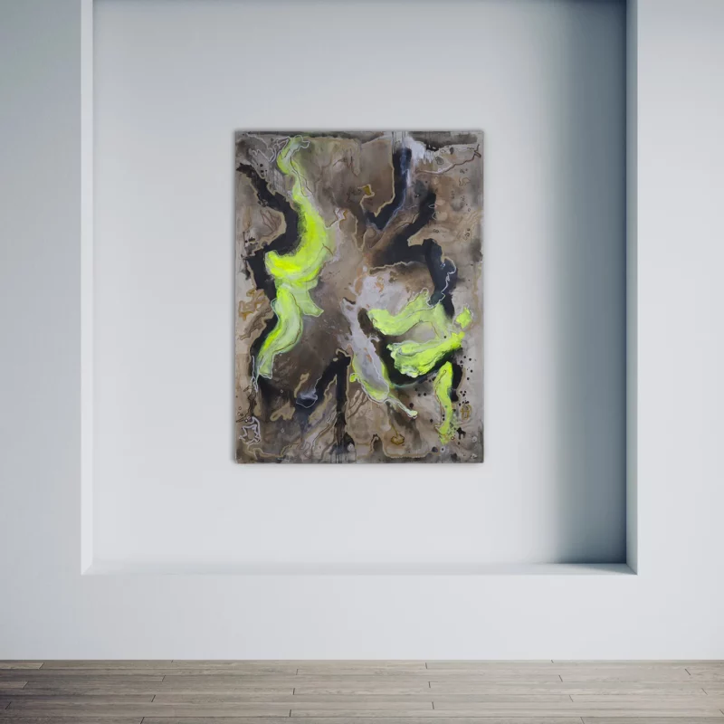Je to obraz touhy. Ne po věcech, ale po stavech – kdy tělo i mysl ztratí tíhu. Slova „GET ME HIGH“ nejsou výzvou k útěku, ale k překročení sebe sama. Nechala jsem barvy téct tak, jak mi tekla energie – rychle, rozmazaně, neřízeně. Je to vrstvení pocitů, které nemají řád, ale mají sílu. Intenzita růžové mě málem pohltila – a to je přesně to, co jsem chtěla. Unést se a pak spadnout zpátky na plátno.